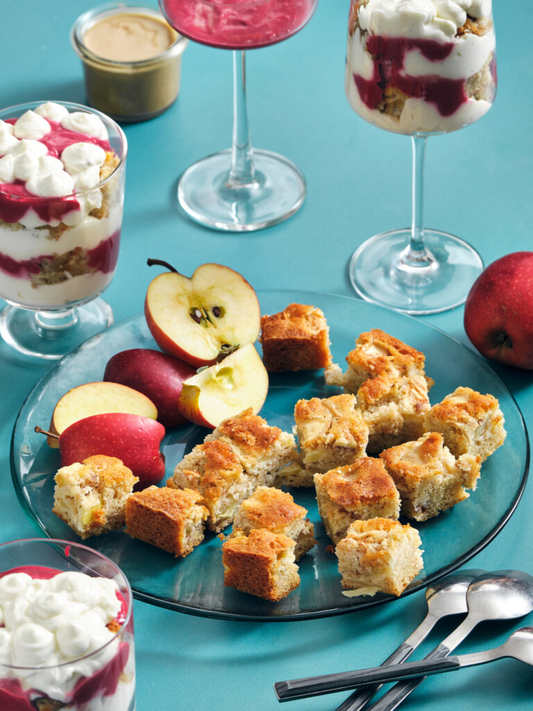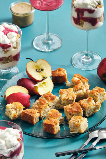 8. Glāzēs veido kārtojumu. Pirmajā kārtā liek krēmu, tad ābola pīrāga gabaliņus, pārlej pāri aveņu un tahini mērci. Visu atkārto, līdz sastāvdaļas izlietotas. Dekorē ar āboliem vai avenēm.