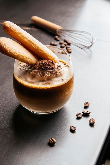 2. Glāzē liek 1–2 bumbas saldējuma un pārlej ar espreso. Pasniedz ar pārbērtām šokolādes skaidiņām un “dāmu pirkstiņiem”.