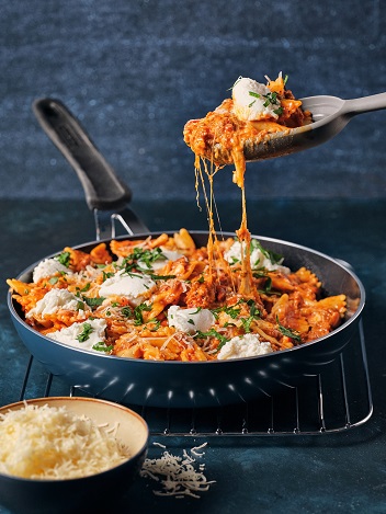 4. Noņem no uguns. Pievieno gabaliņos saplucinātu mocarellas un smalki sarīvētu Parmas sieru, samaisa, līdz siers vienmērīgi sajaucas un izkūst. Izmantojot tējkaroti, pievieno rikotas siera piciņas, uzliek vāku un apmēram 2–4 minūtes ļauj siltumam tās nedaudz izkausēt.