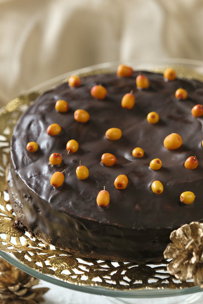 Mēs torti papildinājām ar smiltsērkšķu ogām, kas saldajai tortei piešķir skābenu niansi.