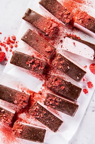 5. Izņem no formas un sagriež. Konfektes mērcē šokolādes glazūrā un apber ar liofilizētiem aveņu gabaliņiem.