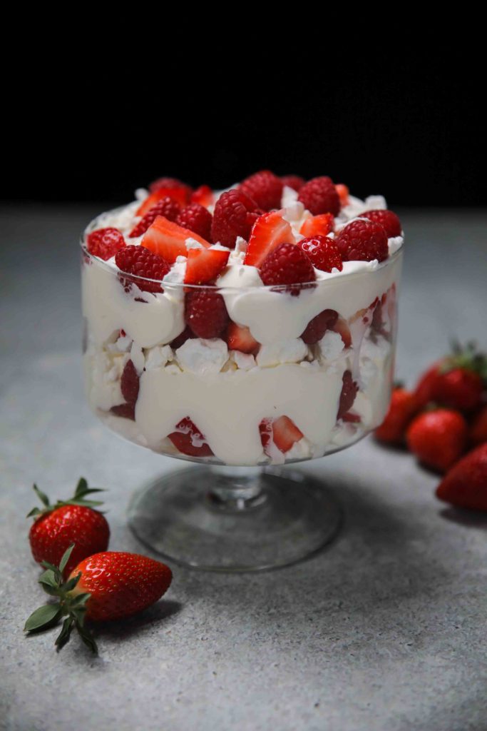 4. Stikla traukā kārto visas sastāvdaļas. Apakšā liek drupinātus bezē cepumus, pāri kārto zemenes un avenes, tad pusi putukrējuma. Atkārto visu vēlreiz, līdz visas sastāvdaļas izlietotas. Dekorē ar veselām ogām un sadrupinātiem bezē cepumiem. Pasniedz uzreiz, jo citādi bezē cepumi kļūs mīksti.