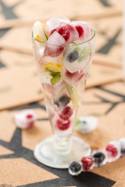 2. Liek saldētavā sasalt. Kad ledus klucīši sasaluši, tos saber maisiņos vai kastītēs un uzglabā saldētavā vasaras dzērieniem kā kokteiļu ledu.