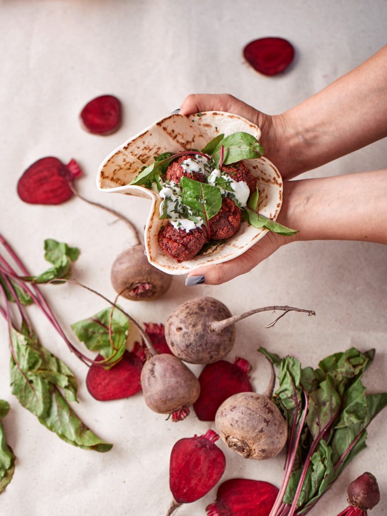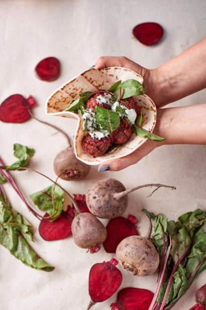 4. Biešu falafelus servē pitas maizītē kopā ar humusu, svaigiem salātiem un jogurta mērci, pagatavojot sev mīļāko variāciju, vai arī ēd kā piedevu pie rīsiem vai kvinojas.