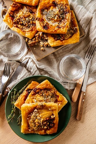 3. Uz kārtainās mīklas gabaliņiem uzsmērē ievārījumu, saliek bumbieru šķēlītes, pārdrupina pāri zilo sieru un sakapātus valriekstus, maliņas pārsmērē ar olu.