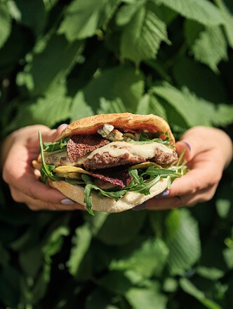 3. Kārto burgerus. Abas burgermaizīšu puses pārsmērē ar “Dimdiņi” tomātu mērci. Uz apakšējās burgermaizītes kārto rukolas lapas, mazsālītu gurķīšu šķēles, dārzeņu čipsus, burgeru gaļu, virsū liekot vēl nedaudz rukolas lapas, drupinātu zilo sieru un dārzeņu čipsus. Pa virsu uzliek otru burgermaizītes pusi.