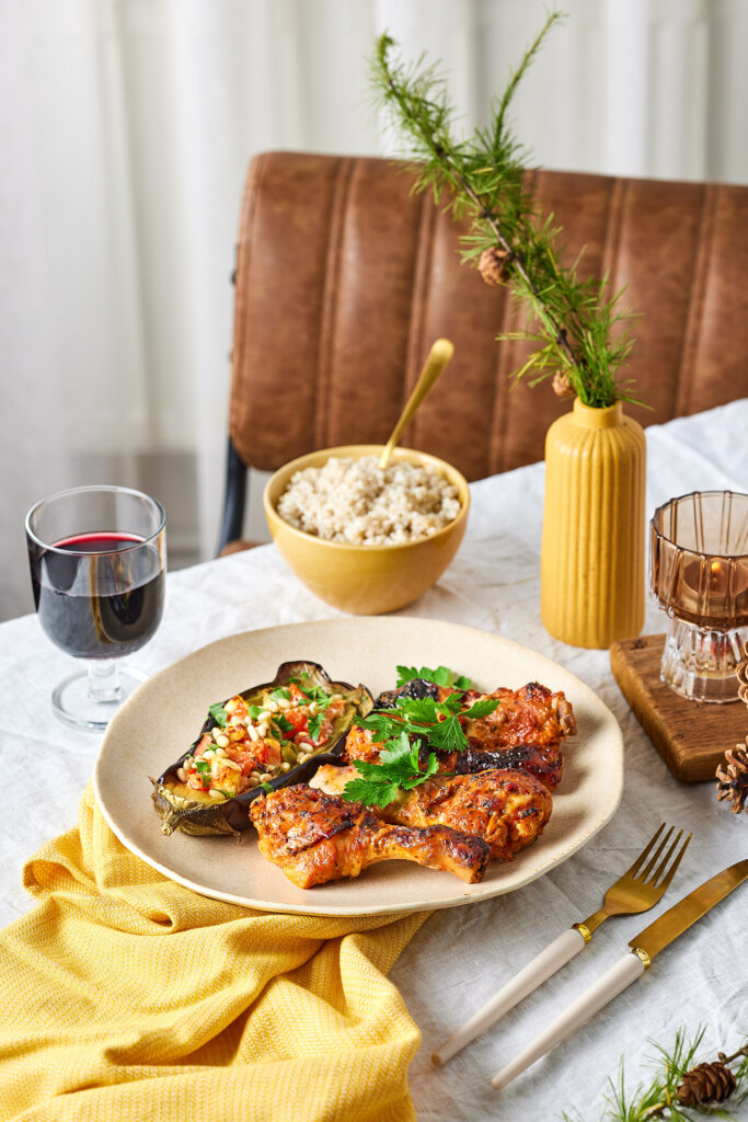 4. Cāļa stilbus pasniedz ar baklažānu laiviņām un pērļu grūbām.