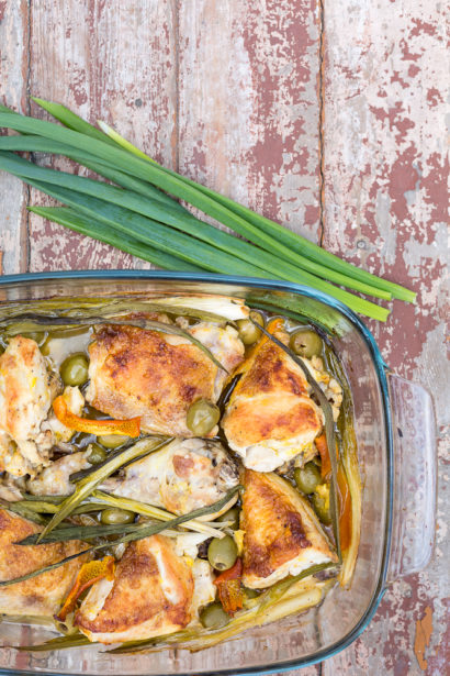 Visbeidzot ķiploka daiviņas ar naža plato galu nemizotas saspiež un sasprauda starp vistas gabaliem. Arī lokus bagātīgi sasprauda starp gaļas gabaliem. Olīvas izbārsta pa visu pannu.