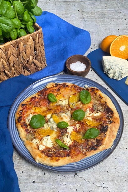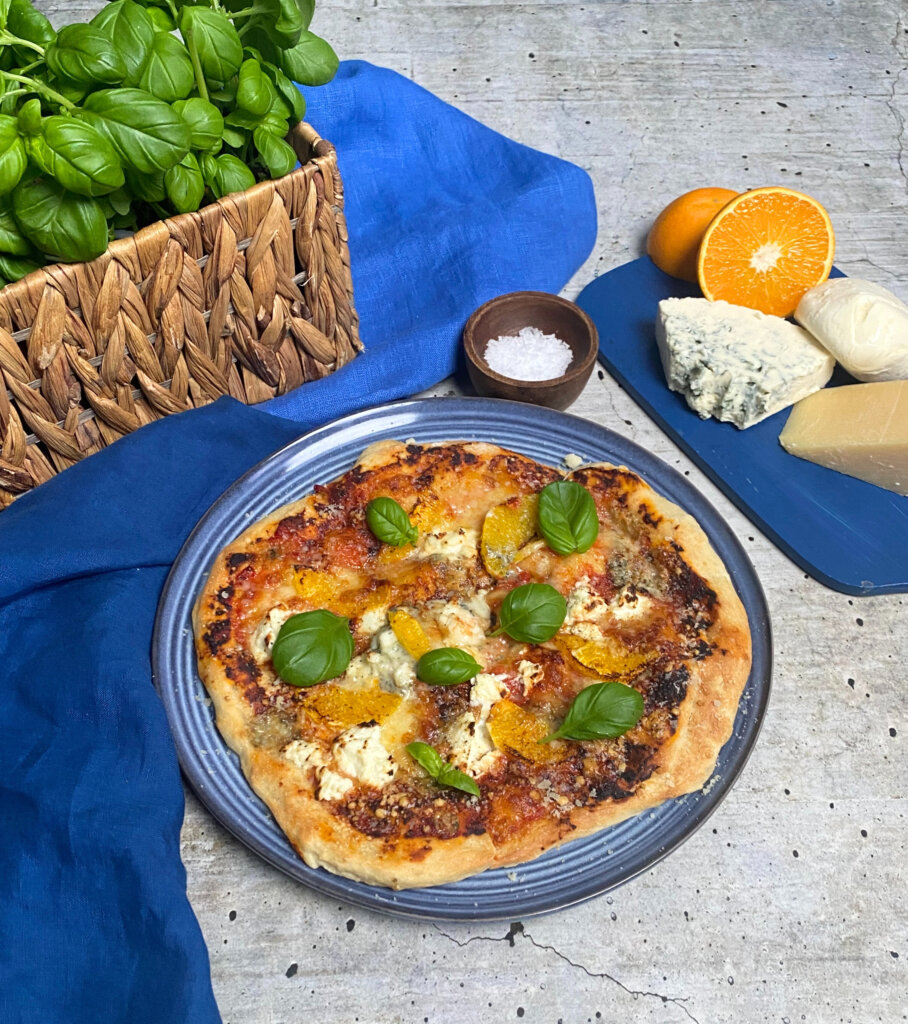 Mīklu sadala četrās daļās, un ar rokām izveido picas pamatni. 3. Tomātu mērcē iemaisa oregano, mērci izlīdzina virs mīklas, visu pārber ar sagrieztu mocarellas, kazas sieru un gorgonzolas sieru un pārkaisa ar sarīvētu Parmas sieru. Virspusē izkārto filētas apelsīna šķēlītes.