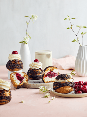 6. Nogriež Choux cepurītes, pilda mazliet krēma, tad liek ķiršu pildījumu, atkārto mazliet krēma un uzliek cepurīti. Ja krēms paliek pāri, tad uz cepurītes vēlreiz var uzspiest to. Dekorē ar svaigiem ķiršiem vai ķiršu pildījumu.