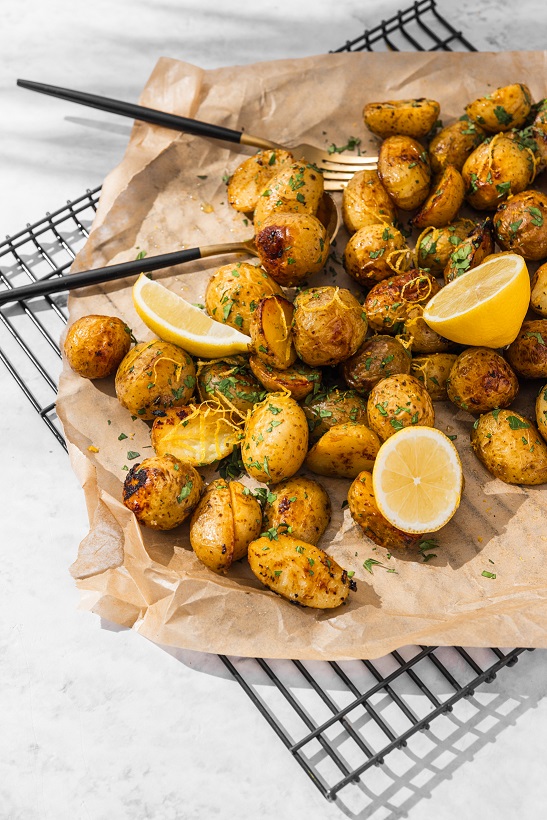 1. Kartupeļus nomazgā un liek uz cepamās pannas. Apslaka ar olīveļļu un apviļā no visām pusēm.