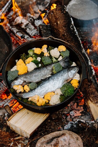 1. Čuguna katlā liek egļu skuju slāni, pa virsu skujām liek foreles, sagrieztus ziedkāpostus un brokoļus, ielej katlā ūdeni tā, lai tas nepieskaras zivij un dārzeņiem.