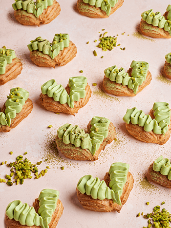 4. Matcha krēmu uzputo un pilda sirsniņās, kam izveidoti caurumiņi no apakšas. Atlikušo krēmu klāj uz augšpuses. Dekorē ar ziediņiem, matcha pulveri, smalcinātām pistācijām, avenēm.