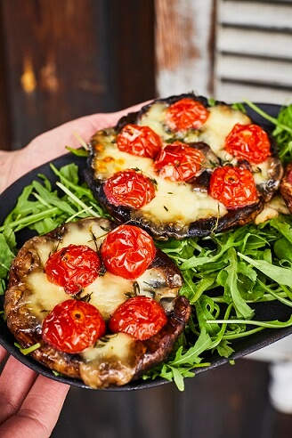 2. Sēnes iedobē liek uz pusēm pārgrieztus ķiršu tomātus, mocarellas bumbiņas, pārber ar sāli un apslaka ar olīveļļu. Liek uz grila vai cepeškrāsnī cepties vēl dažas minūtes, līdz siers izkūst.