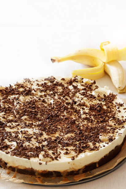 Rotā ar sarīvētu šokolādi un banānu gabaliņiem. Kūku liek ledusskapī uz dažām stundām.