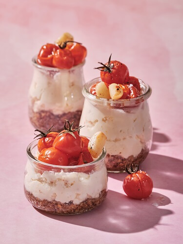 4. Nelielos trauciņos vai burciņās liek pa karotei pamatnes masas, nedaudz piespiež, tad liek krēmu un pa virsu ķiršu tomātus.