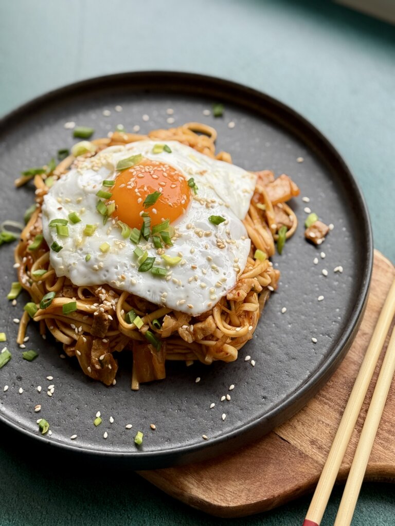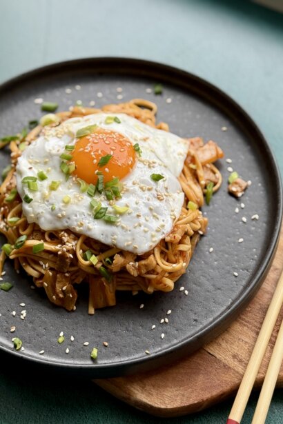 4. Pievieno kimči mērci un novārītās nūdeles. Visu rūpīgi samaisa un uzkarsē.