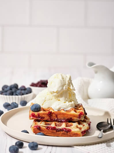 4. Karstas ķiršu pīrāga vafeles pasniedz ar ogām, saldējumu un pūdercukuru.