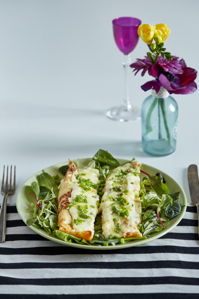 Mazliet citādas pildītās pankūkas. Pankūkas interesantākas padara jau mīklā pievienotie lociņi un to cepšana krāsnī kopā ar mērci. Silts un sātīgs ēdiens.