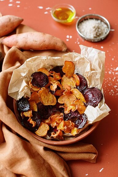 1. Kārtīgi nomazgā dārzeņus ar kādu birsti, jo tos ieteicams griezt ar visu mizu, tad sanāks kraukšķīgāki čipsi.