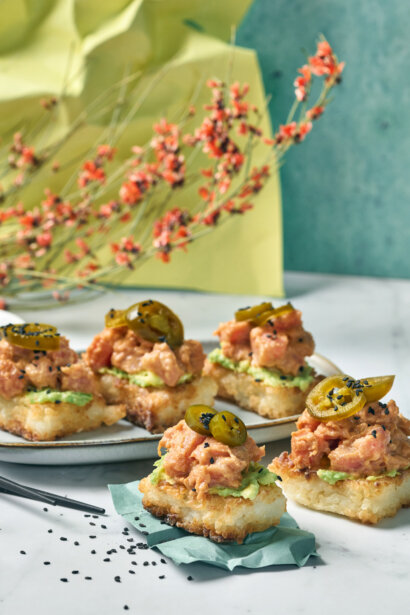5. Uz katra kraukšķīgā rīsu kubiņa liek avokado masu, tad tunci un halapenjo piparu ripiņas.
