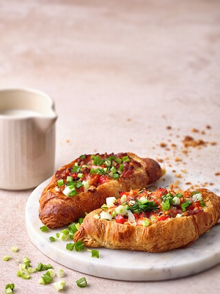 3. Bļodā sakuļ olas ar pienu, pievieno apceptos šampinjonus, smalki sagrieztu papriku, sarīvētu sieru, bekonu un garšvielas. Masu pilda kruasānu laiviņās.