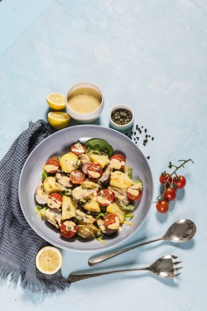 3. Vārītos kartupeļus, makreli un salātlapas sagriež. Visu kārto šķīvī, pāri lej mērci un pārber ar kaperiem.