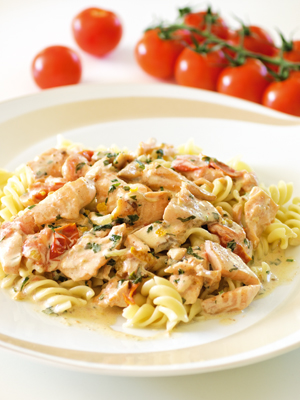 Starp maigām pastas spirālītēm, kas ir tieši al dente, paslēpušies skābeni ķiršu tomātiņi un sātīgi laša filejas gabaliņi. Šim ēdienam ir burvīgs aromāts, ko piešķir pētersīļi un rīvēta apelsīna miziņa.