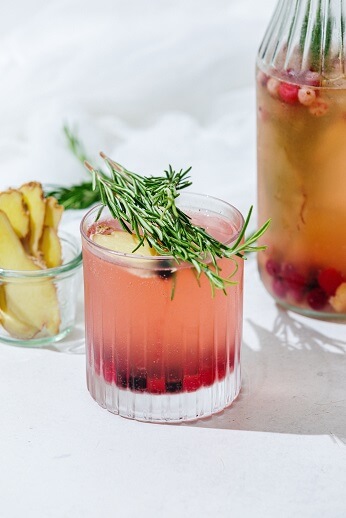 1. Liepziedu kombučai pievieno 60 g dzērveņu, 4 rozmarīna zariņus, ingvera gabaliņus un liek ledusskapī uz 2–4 dienām.