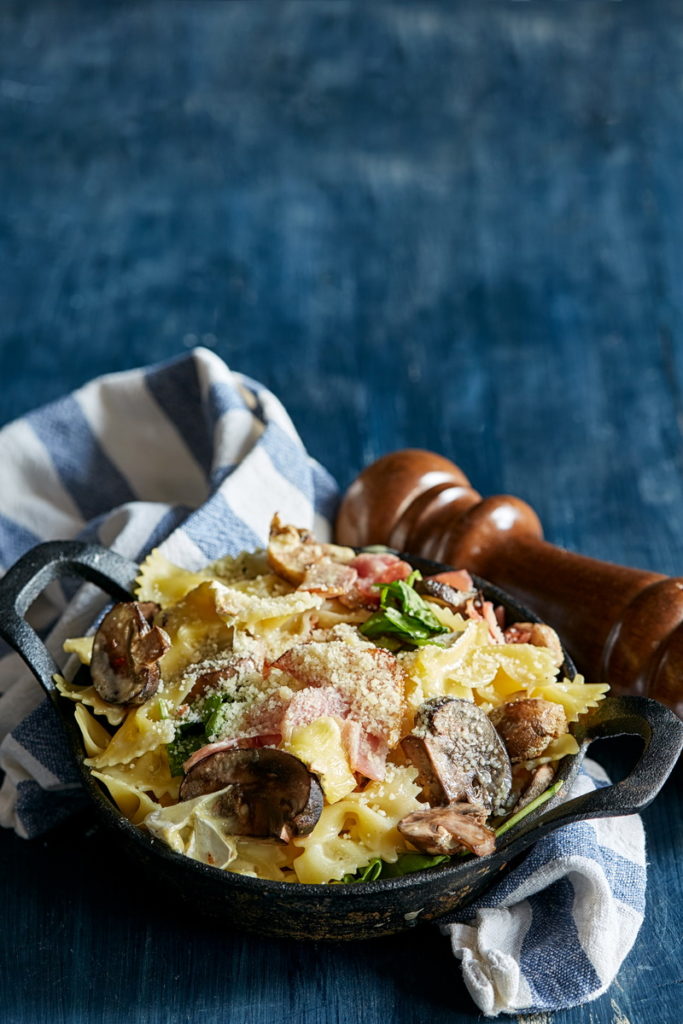 Uzkarsētā pannā apcep bekonu kopā ar timiāna zariņiem, pievieno sīpolus un sēnes. Tad timiāna zariņus izņem, pievieno saldo krējumu un makaronus. Visu samaisa un noņem no uguns. Masā iemaisa brī sieru.