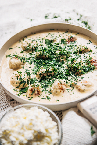 3. Pamazām pannā pievieno buljonu, tad saldo krējumu, sinepes, sāli un piparus. Mērci vāra, līdz tā sāk burbuļot, turpat mērcē pievieno atpakaļ gaļas bumbiņas, un visu kopā pasutina vēl 10 minūtes, līdz mērce kārtīgi sabiezējusi un gaļas bumbiņas gatavas.