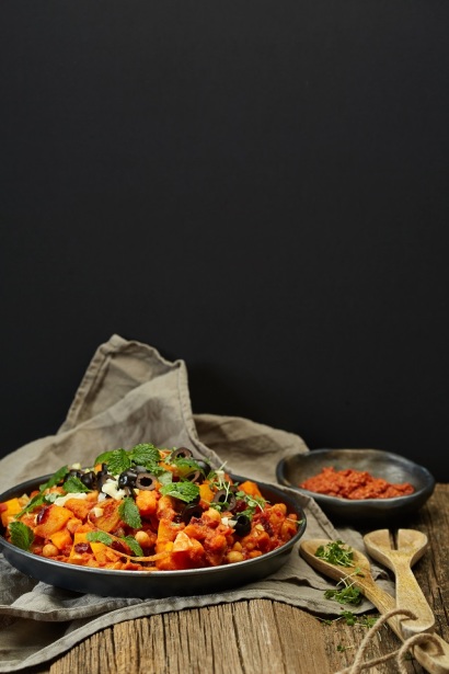 Tāpat kā karijs ir gan ēdiens, gan garšviela, arī tadžīna ir gan divdaļu konusveida māla trauks, gan marokāņu sautējums, ko gatavo šajā traukā. Šoreiz gan neizmantoju tadžīnu, lai pagatavotu šo sautējumu, taču sastāvdaļas un rezultāts ir ļoti līdzīgs. Šis ēdiens ir lielisks piemērs tam, kā salds ar asu iet kopā kā cimds ar rociņu. Aprikozes, žāvētas dzērvenes un čili pipari vai harisas pasta saprotas ļoti labi.