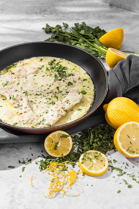 2. Pannā izkausē sviestu un uzkarsē ar eļļu. Liek cepties smalki sagrieztu sīpolu un ķiplokus, līdz tie paliek mīksti. Pievieno sinepes, citronu sulu, kokosriekstu pienu un uzkarsē līdz pirmajam burbulim. Tad ieliek zivs filejas un zem vāka sutina apmēram 10 minūtes, līdz zivs gatava. Pasniedz ar sakapātiem pētersīļiem.