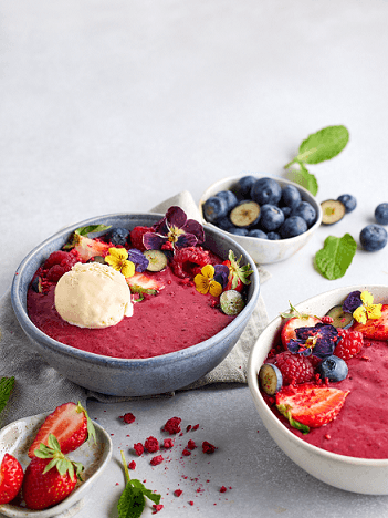 2. Lej šķīvjos, pa vidu liek saldējuma bumbiņu, dekorē ar svaigām ogām un piparmētru lapiņām.