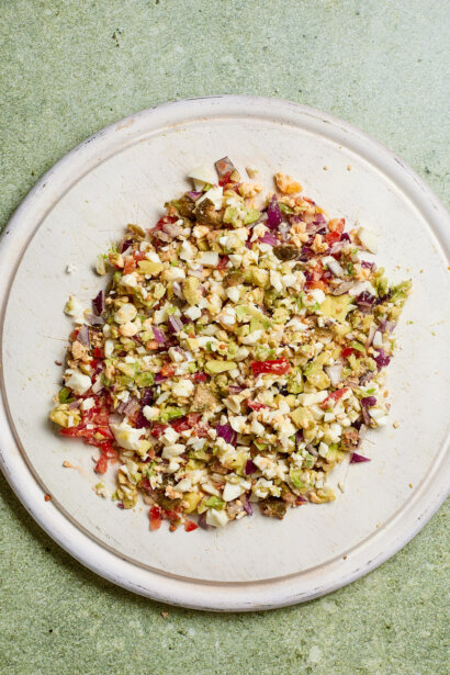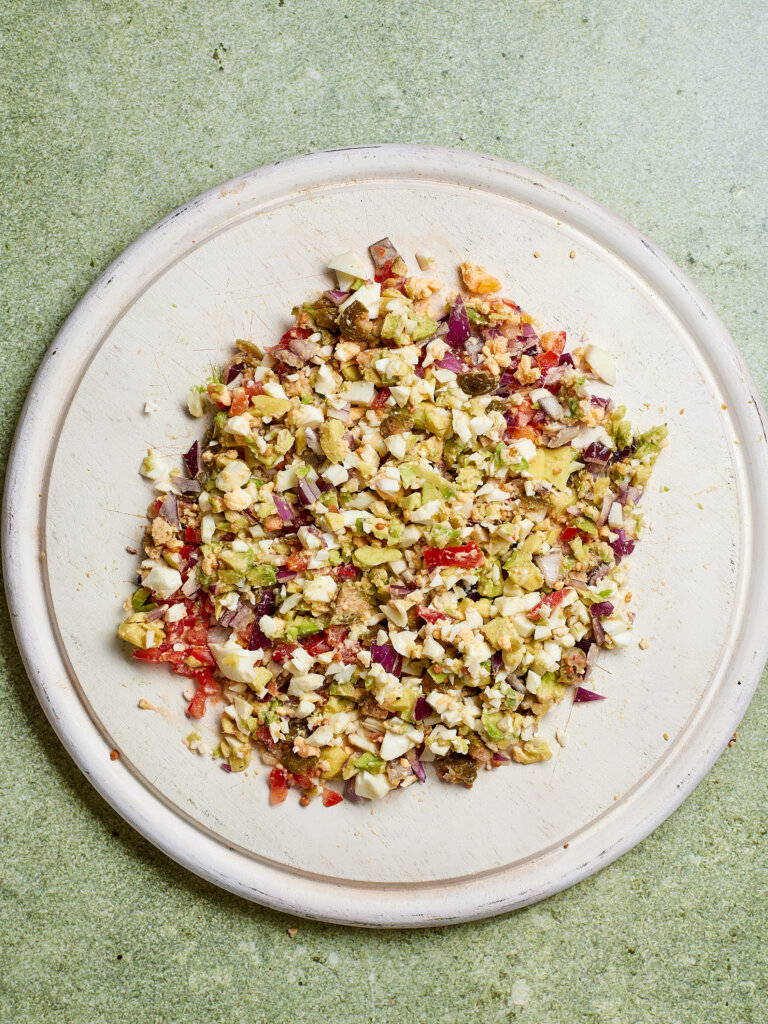 2. Visas sastāvdaļas (izņemot maizīti) liek uz dēļa. Apkaisa ar sāli un pipariem. Ar labu nazi visu kapā tik ilgi, līdz visas sastāvdaļas smalki sakapātas.