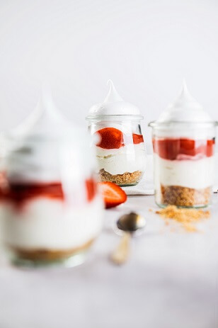 4. Sablendē 2/3 zemeņu. Pārējās zemenes sagriež gabaliņos. Sajauc. Liek trauciņos virs krēma kārtas.