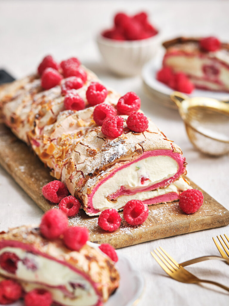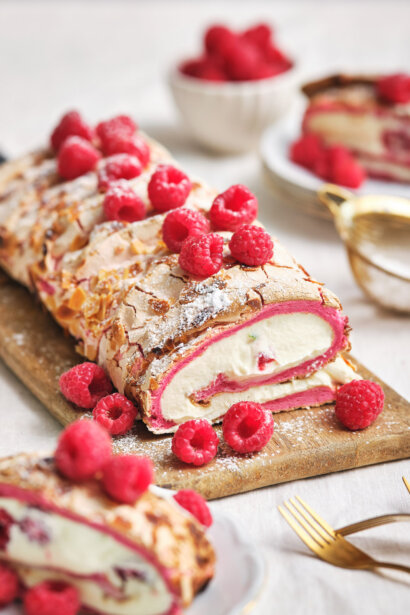 5. Masu izsmērē uz izceptā olbaltuma un izkārto ogas. Ar cepamā papīra palīdzību ruleti sarullē ar savienojumu uz leju.