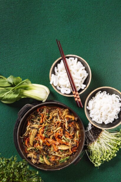 7. Pagatavo dārzeņu voku. Šalotes sīpolus sagriež plānās šķēlītēs, ķiploka daiviņas sarīvē, papriku sagriež strēmelītēs, arī sēnes un pakčoja kātus sagriež malkās strēmelēs, bet lapu daļu – lielos gabalos.