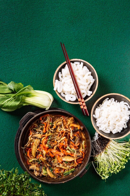 9. Uz ietaukotas un uzkarsētas pannas liek sīpolus un ķiplokus, apcep, līdz tie ir zeltaini brūni un mīksti. Tad pievieno papriku un sēnes, ļauj pāris minūtes pasautēties. Pievieno pakčoja kātus un pupiņu asnus un apcep. Pievieno pakčoja lapas.