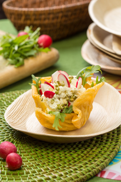 Šoreiz piedāvāju jums uzkodu ēdamās bļodiņās. Pašas bļodiņas ir pikantas un kraukšķīgas, bet pildījums – svaigi pavasarīgs. Salātu mērce ir vairāk nekā krēms, kura pamatā šoreiz ir nevis jogurts, eļļa vai skābais krējums, bet gaisīgas saldā krējuma putas. Tikai bez salduma.