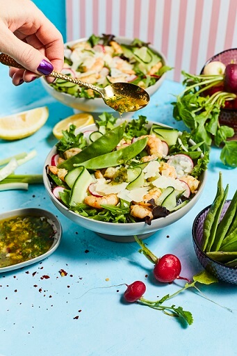 3. Bļodā izkārto lapu salātus, virs tiem liek pārējās sastāvdaļas. Ar mizotāju sašķēlē gurķi, smalki sagriež redīsus, strēmelēs sagriež cukurzirņus un tad liek garneles. Salātus dāsni aplej ar mērci un pasniedz ar smalki sarīvētu Parmas sieru.