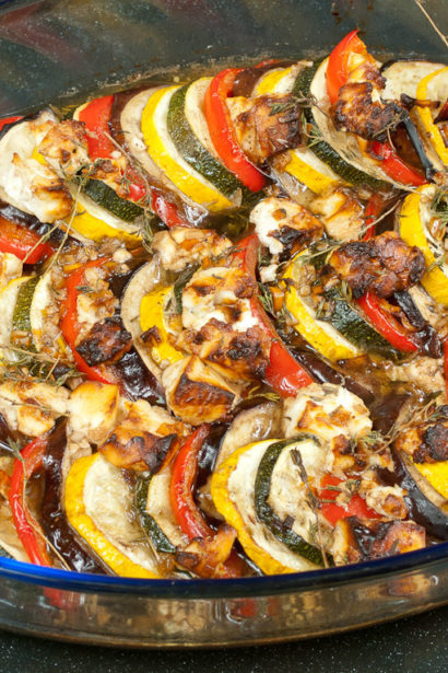 1. Nomazgā dārzeņus un sagriež aptuveni 0,5-1 cm biezās ripiņās. Sagrieztos dārzeņus kārto stikla vai metāla cepamajā traukā. Ja nav pacietības veidot krāsainas un kārtīgas dārzeņu rindas, var sagrieztās ripas salikt izvēlētajā traukā bez jebkādas sistēmas.