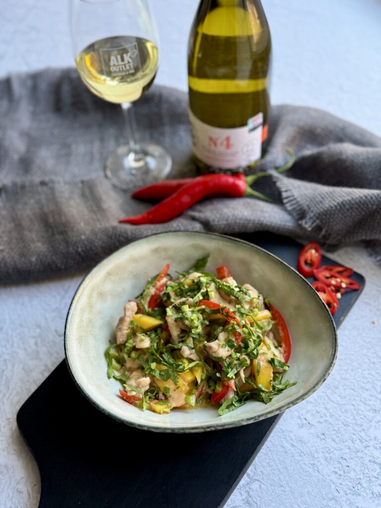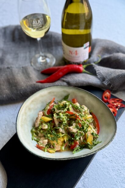 6.  Vokpannā uzkarsē eļļu un liek cepties papriku un mango. Nedaudz apcep, tad pievieno vistu un zirņus. Pievieno ingveru un turpina cept. Tad pievieno mērci, iemarinēto mango, lociņus un iemaisa.