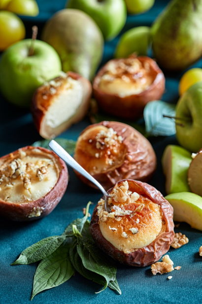 4. Gatavo masu lej ābolos. Liek tos uz cepamās pannas un cep krāsnī 25–30 minūtes vai kamēr siera kūkas masa sarecējusi. Pēc cepšanas mazliet atdzesē un apber ar grauzdētiem riekstiem.