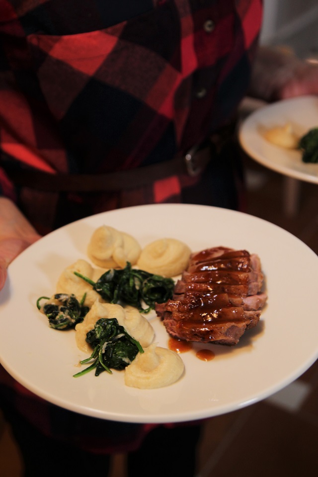 7. Uz šķīvja kārto katram ēdājam šķēlītēs sagrieztu vienu pīles krūtiņu, kas pārlieta ar mērci. Blakus pasniedz pastinaku biezeni un sautētos spinātus.