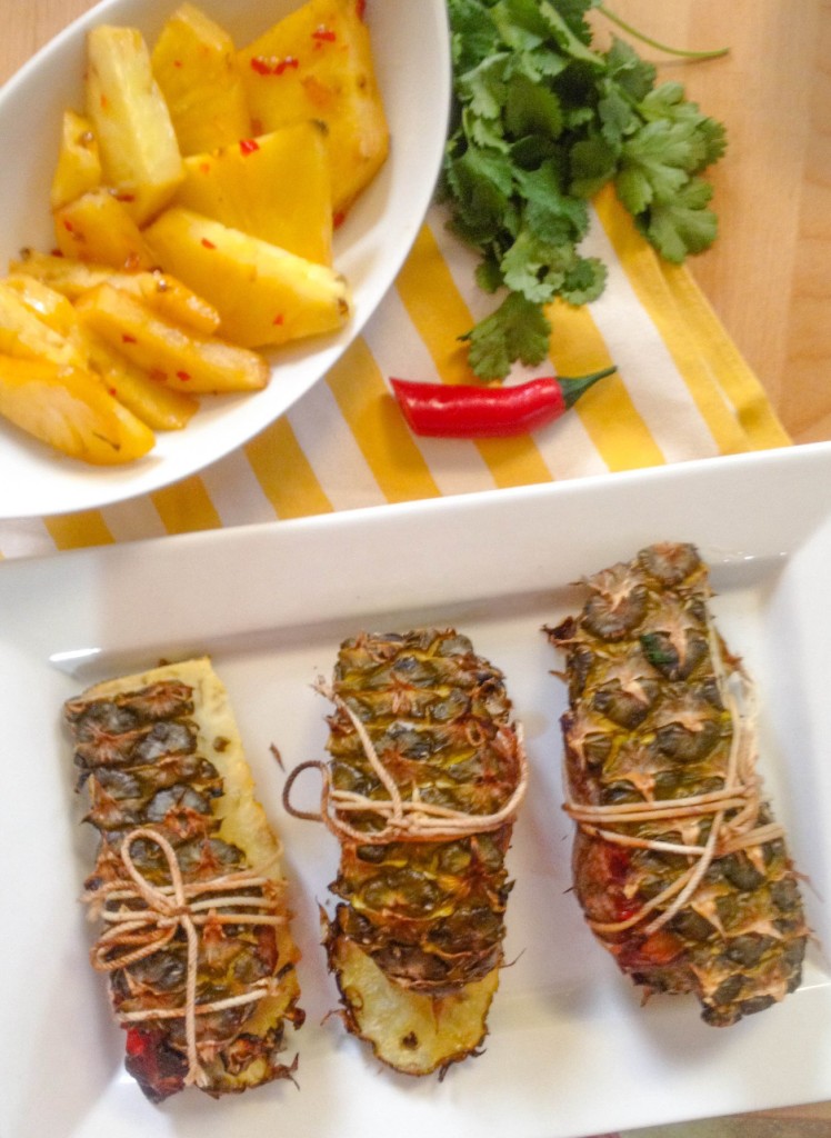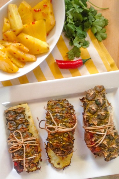 5. Katru krūtiņu ietin divās ananāsu mizu šķēlītēs un apsien ar pārtikas diegu. Ietin folijā un liek cepties 160 grādus sakarsētā krāsnī uz 15 minūtēm.