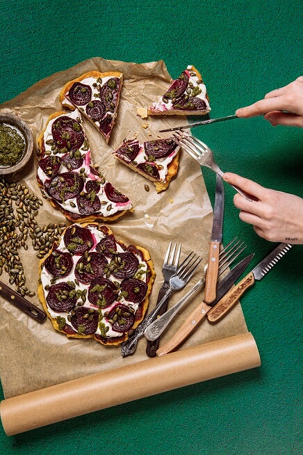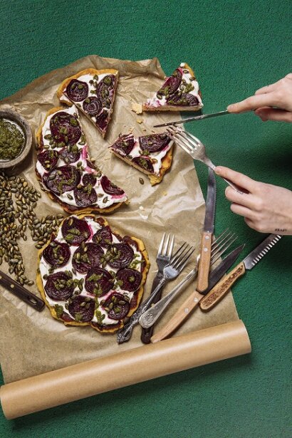 7. Kad viss gatavas, ņem plakanmaizi, smērē bagātu kārtu ar smēriņu, kārto bietes, uzpilina pesto pāri visai maizītei un pārber ar sēkliņām.