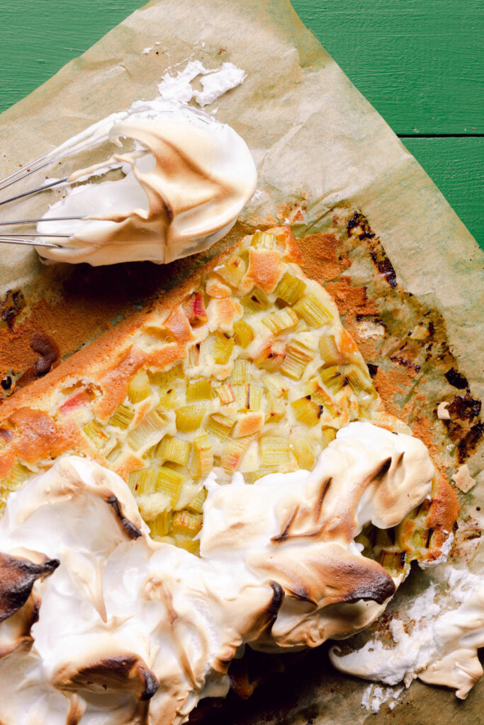 3. Mīklu lej ietaukotā 20 x 27 cm formā, apber ar rabarberiem un liek līdz 170 ºC temperatūrai sakarsētā cepeškrāsnī uz 35–40 minūtēm, līdz tā ir zeltaini brūna.