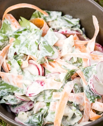 Redīsus nomazgā, nosusina un sagriež ripiņās. Salātlapas saplūkā.