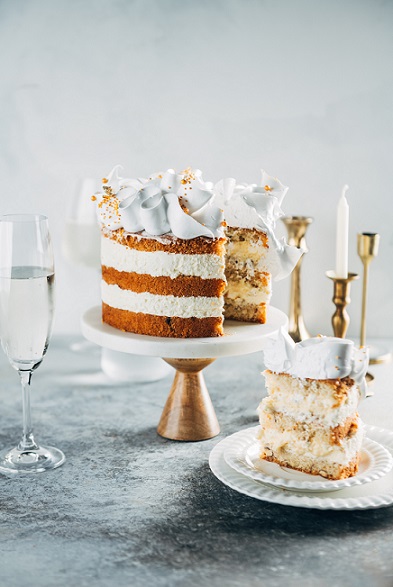 5. Pagatavo meringu. Vidējā ātrumā puto olu baltumus. Katliņā uzvāra cukuru ar ūdeni līdz 115 °C temperatūrai. Palielinot putošanas ātrumu līdz maksimumam, lēnām gar trauka malu lej olu baltumā. Turpina putot, mazliet samazinot ātrumu, līdz stingrai konsistencei. Pilda konditorejas maisā un veido vēlamo kūkas dekoru.
